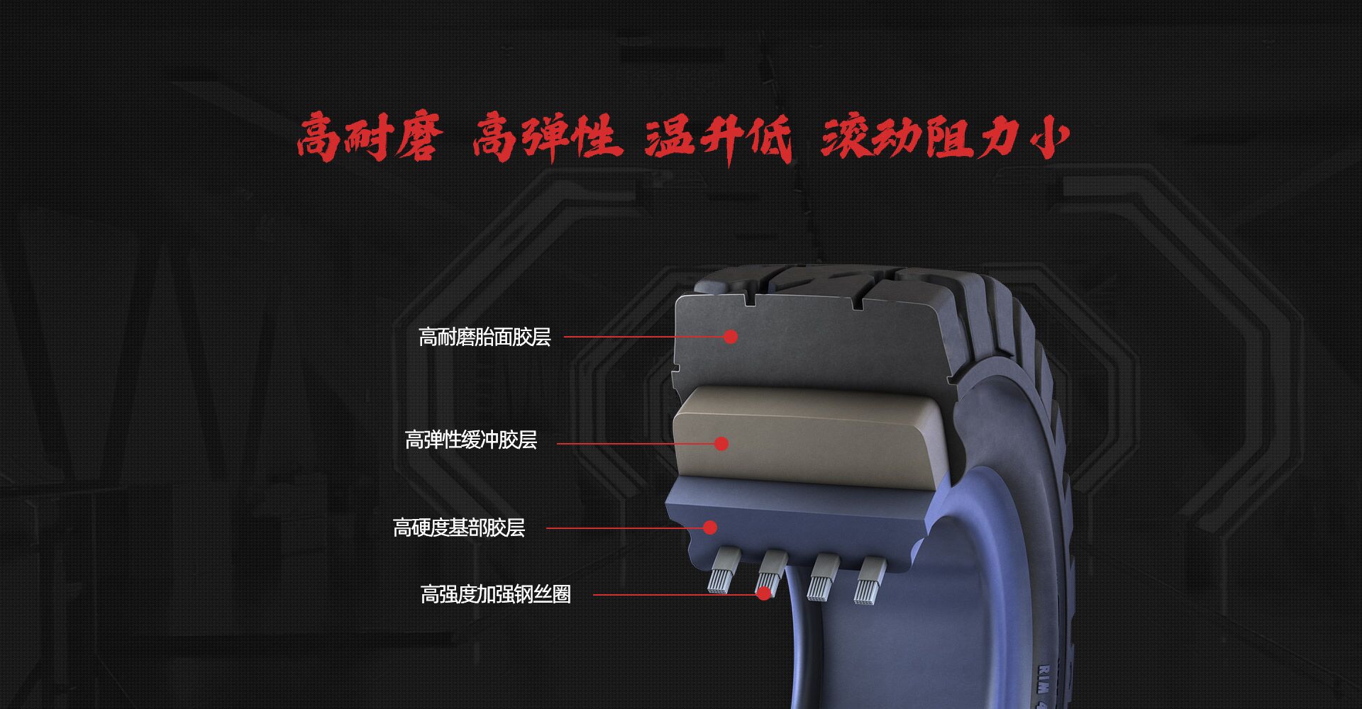 實心輪胎主要適用于地面復(fù)雜惡劣工況下的叉車、拖車、裝載機(jī)、軍用車輛等機(jī)械車輛的配備,廣泛應(yīng)用 于鋼鐵廠、礦山、建筑工程、港口、物流、廢金屬加工廠等領(lǐng)域。 實心輪胎胎體為全橡膠構(gòu)成,最大限度地保證了輪胎的耐刺穿性,從根本上消除了工業(yè)車輛在承載運(yùn)行過 程中及在惡劣的作業(yè)環(huán)境中的輪胎刺穿隱患。實心輪胎的負(fù)荷—形變量小、運(yùn)行穩(wěn)定性好,因其耐刺耐撕、耐 高溫、耐腐蝕、耐磨損,無需充氣,避免了頻繁補(bǔ)胎換胎的繁重勞動,可提高車輛的使用率和工作效率,在低 速、高效運(yùn)行車輛